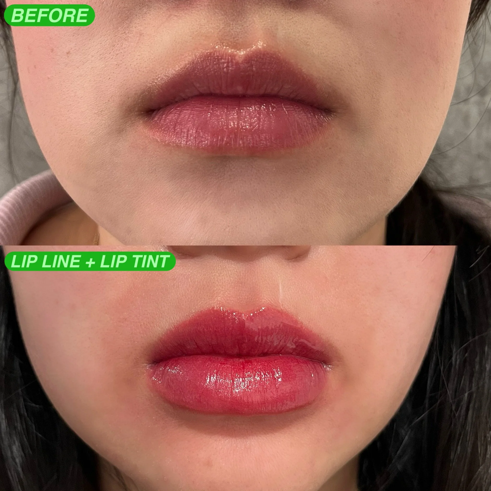 Lip Tint improves the overall color of your lips whether you have previous lip tattoos, flushed dull lips, or uneven lip colors with a natural tint like effect. This is for those who like the shape of their lips and want to improve color. The lip tint alone does not include lip line.